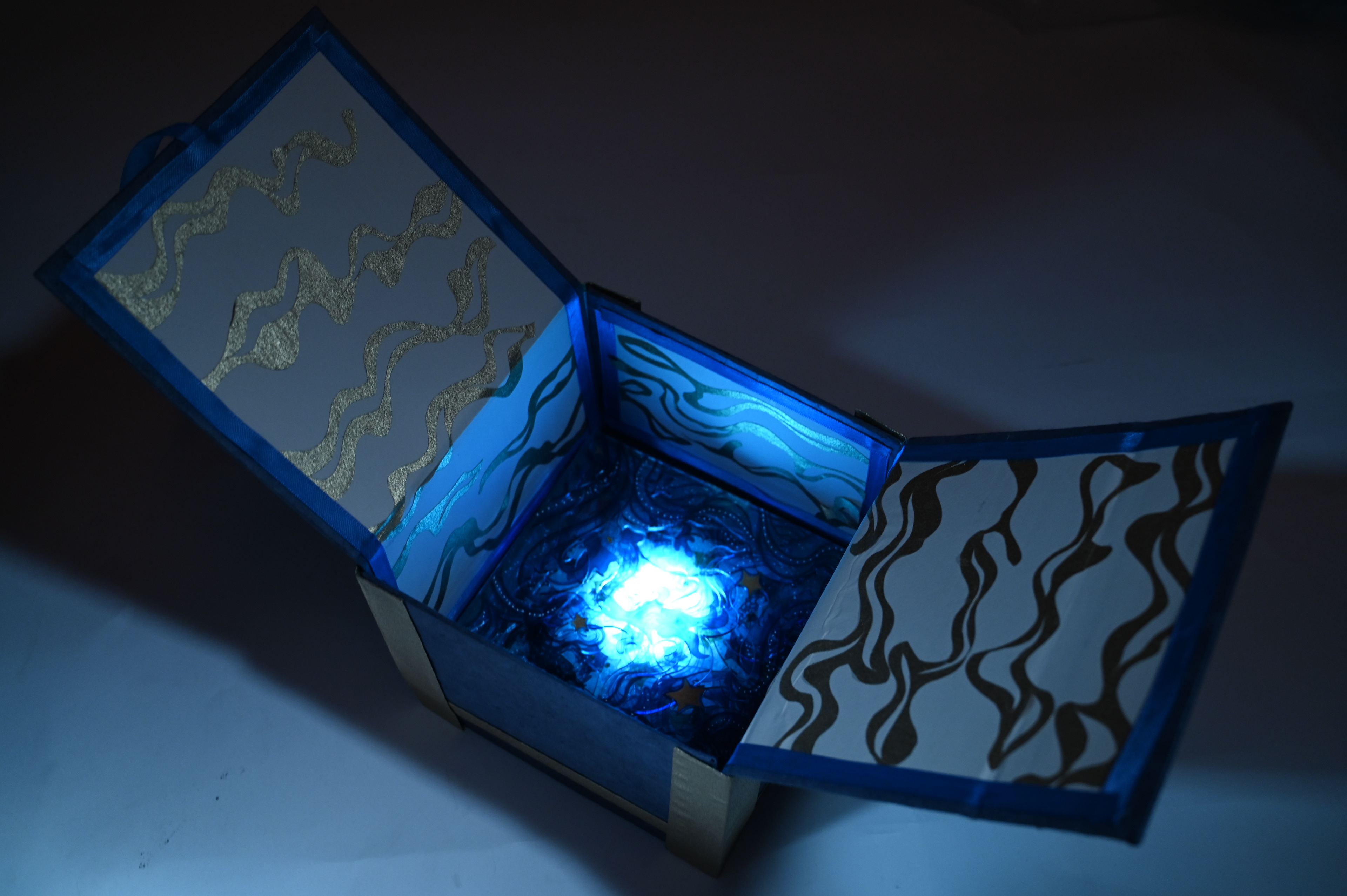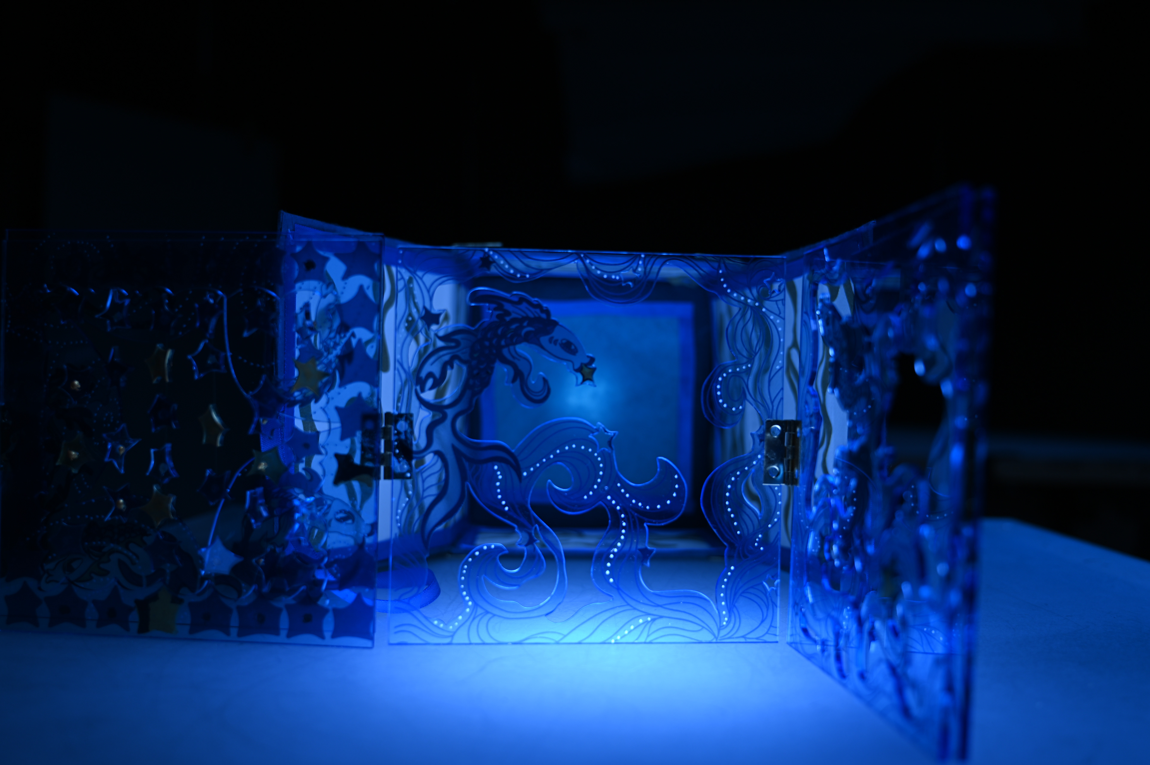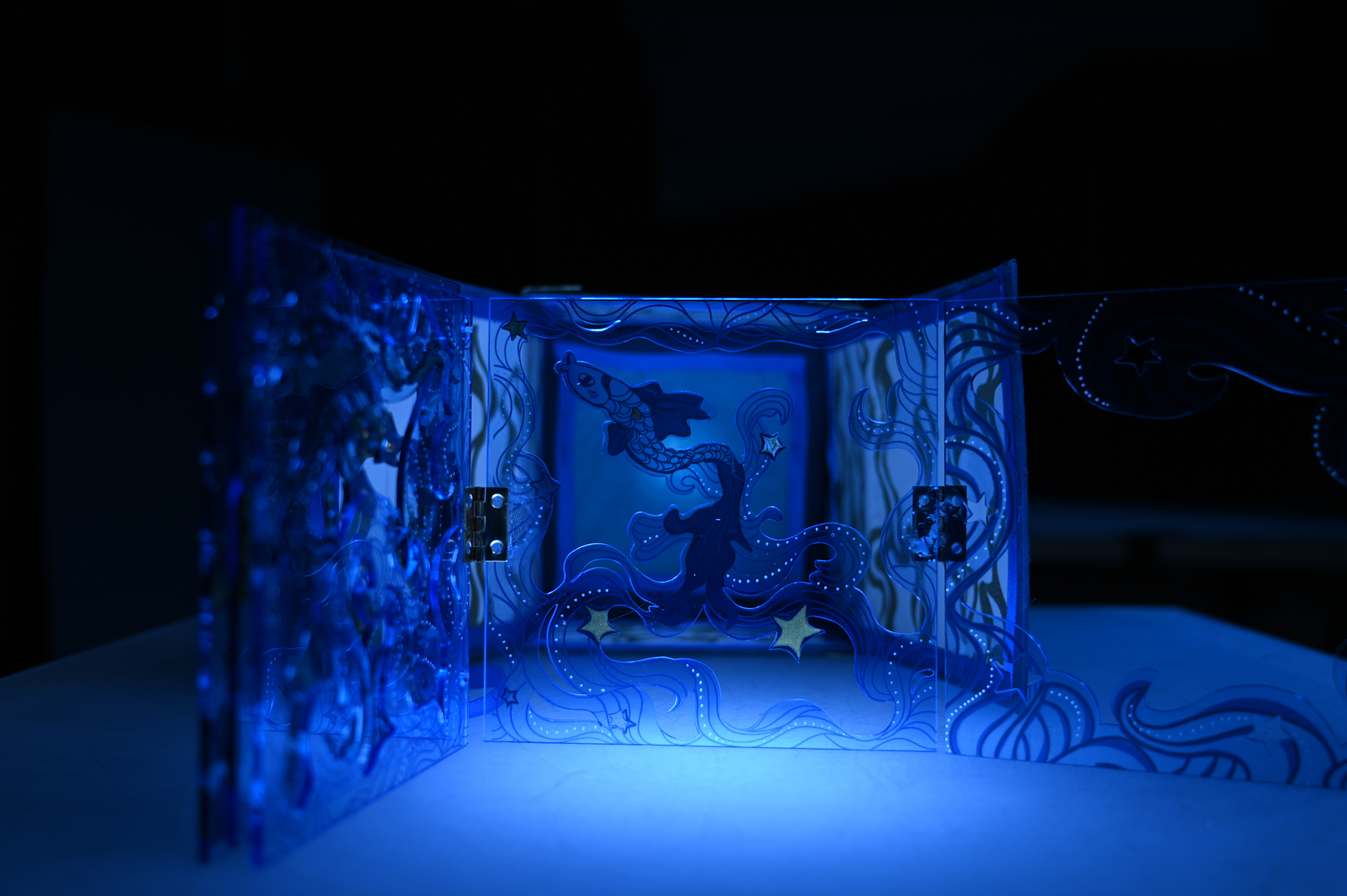 The concept of ‘I Went Fishing and Caught a Shooting Star’, was born out of an attempt to combine bookmaking with my affinity for creating night lights. This book functions as an accordion book, a tunnel book, and a movable night light. The ‘cover’ contains a light inside, and the sides fold out to create a tunnel for viewing. Once you take out the book from its cover, place the box on its side, push the center to turn on the light, and arrange it to your preference. The 5 plexiglass panels depict a descent into an ocean roaring with shooting stars born out of sea foam, whirling with fish and lost wishes. Both UV printed and hand painted. This process allowed me to explore the book as a loved, reusable object and expand my definition of what a book is, and what it could be.