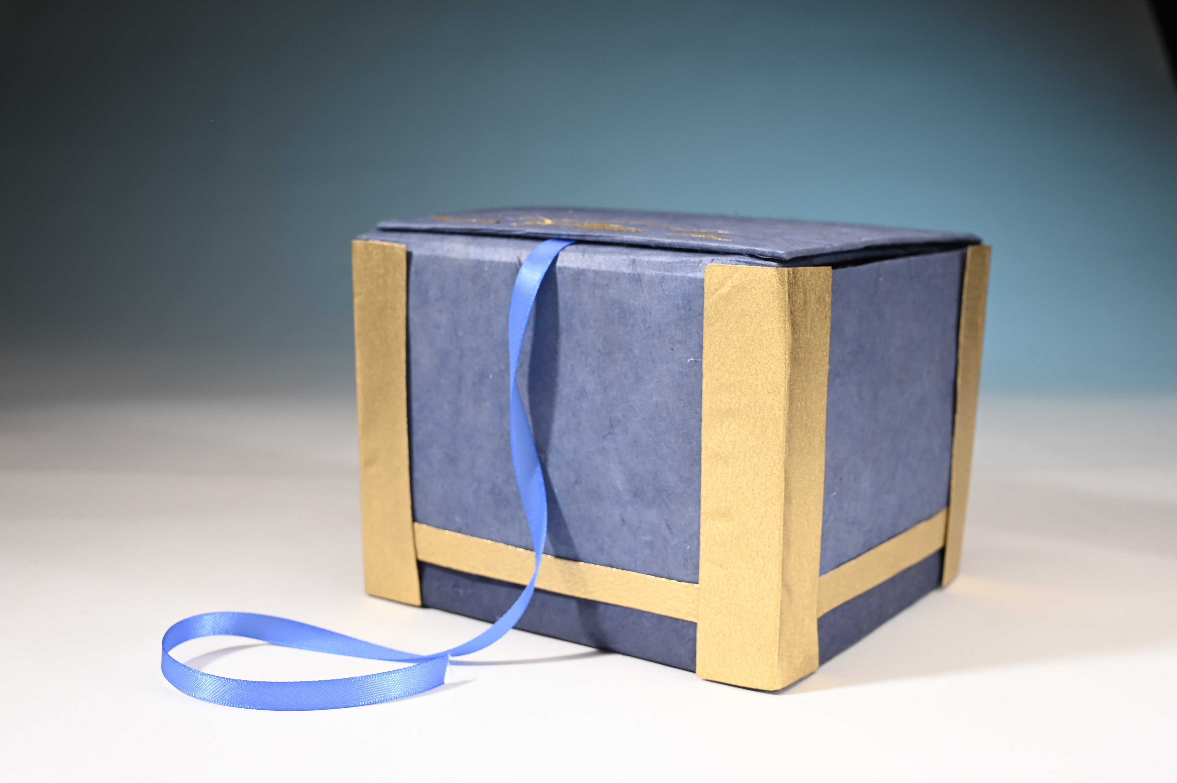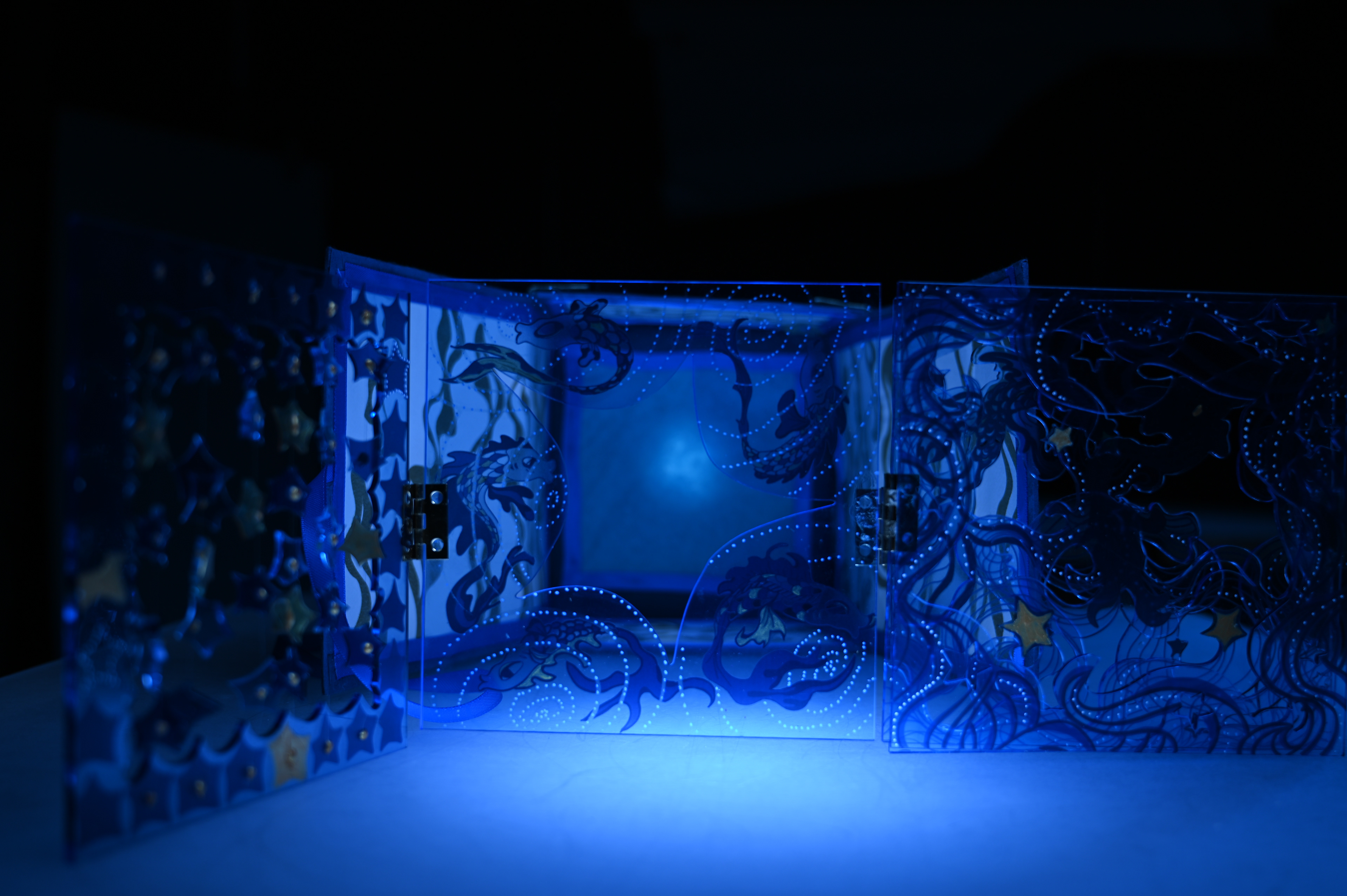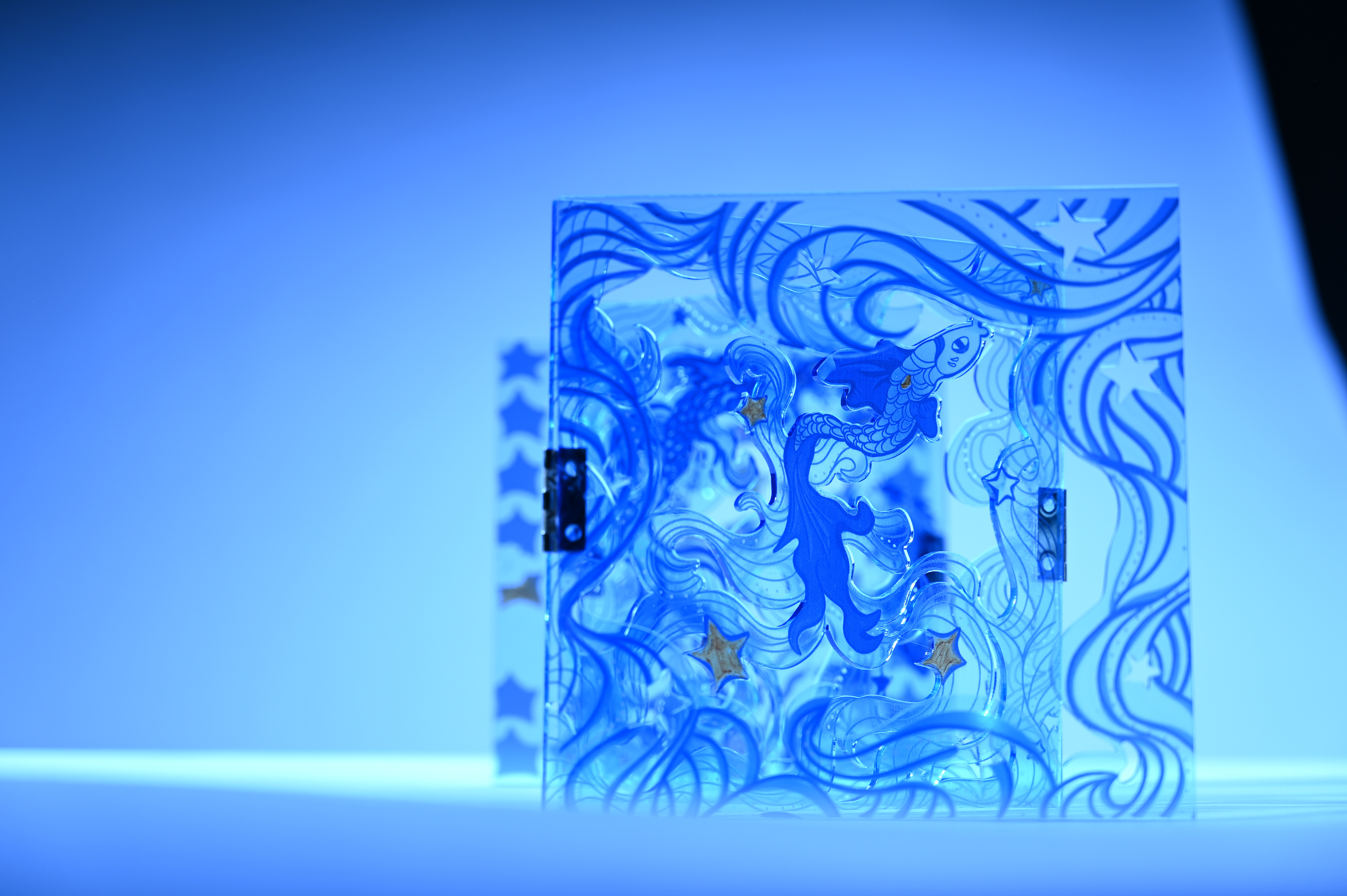 The concept of ‘I Went Fishing and Caught a Shooting Star’, was born out of an attempt to combine bookmaking with my affinity for creating night lights. This book functions as an accordion book, a tunnel book, and a movable night light. The ‘cover’ contains a light inside, and the sides fold out to create a tunnel for viewing. Once you take out the book from its cover, place the box on its side, push the center to turn on the light, and arrange it to your preference. The 5 plexiglass panels depict a descent into an ocean roaring with shooting stars born out of sea foam, whirling with fish and lost wishes. Both UV printed and hand painted. This process allowed me to explore the book as a loved, reusable object and expand my definition of what a book is, and what it could be.